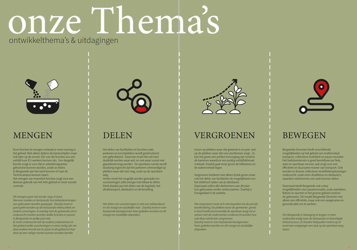 Uit de diverse gesprekken hebben we vier thema's vastgesteld waar de ontwikkelingen aan zouden moeten voldoen, namelijk: "mengen, delen, vergroenen en bewegen".